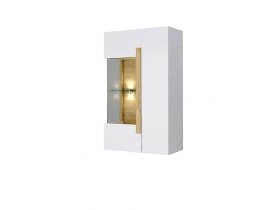 Корпус и фасады витрины выполнены из Европлиты (ЛДСП) 18мм белый глянец. Кромка витрины — ПВХ глянец. Стекло для корпуса, дверей и полок — прозрачное 6мм. Дверь со стеклом и ручкой. Ручка и планка из натурального дерева (дуб). Глухая дверь выполнена из Европлиты (ЛДСП) 18 мм с механизмом открывания «Push to open». Полкодержатели стеклянных полок — металлические хромированные. Внутреннее наполнение в цвете дуб крафт. Витрина явялется универсальная левой или правой в зависимости от монтажа. Возможна установка подсветки в витрину, которую можно использовать как дополнительное освещение в Вашей комнате.