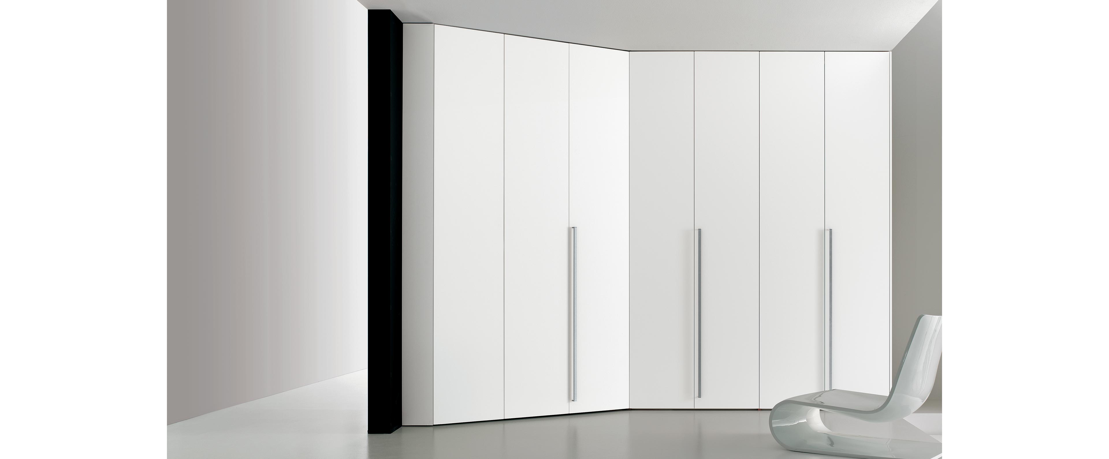 Для того, чтобы сполна насладиться удобством гардеробной, можно реализовать скошенную угловую композицию, разместив за распашными створками самую настоящую раздевалку с зеркалами и различными принадлежностями, служащими для удобства и эффектности ежедневного ритуала одевания.