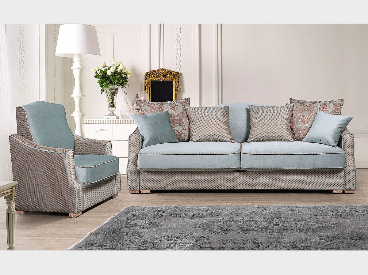 Диван в комплекте с креслом подойдёт как для интерьера просторного помещения, так и небольшой по размерам комнаты.