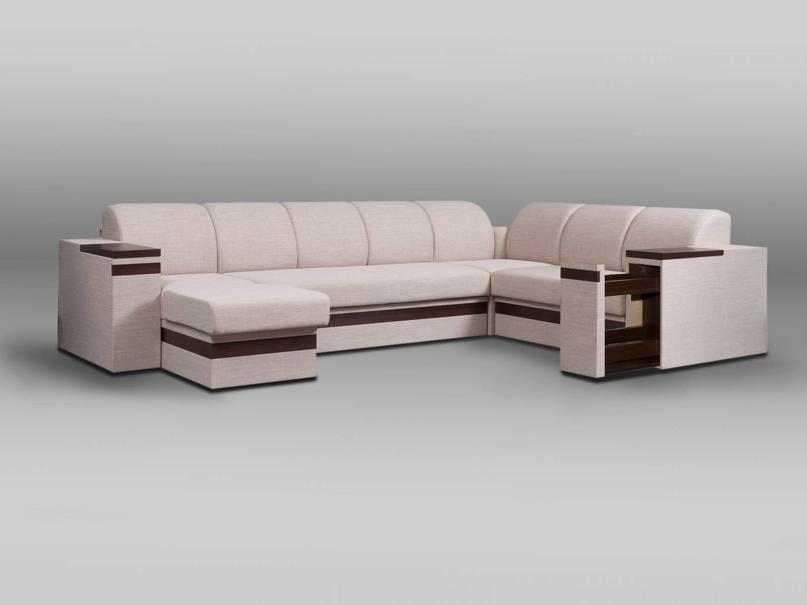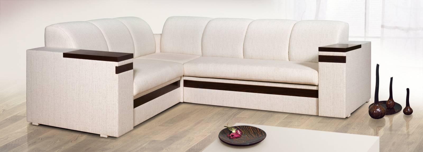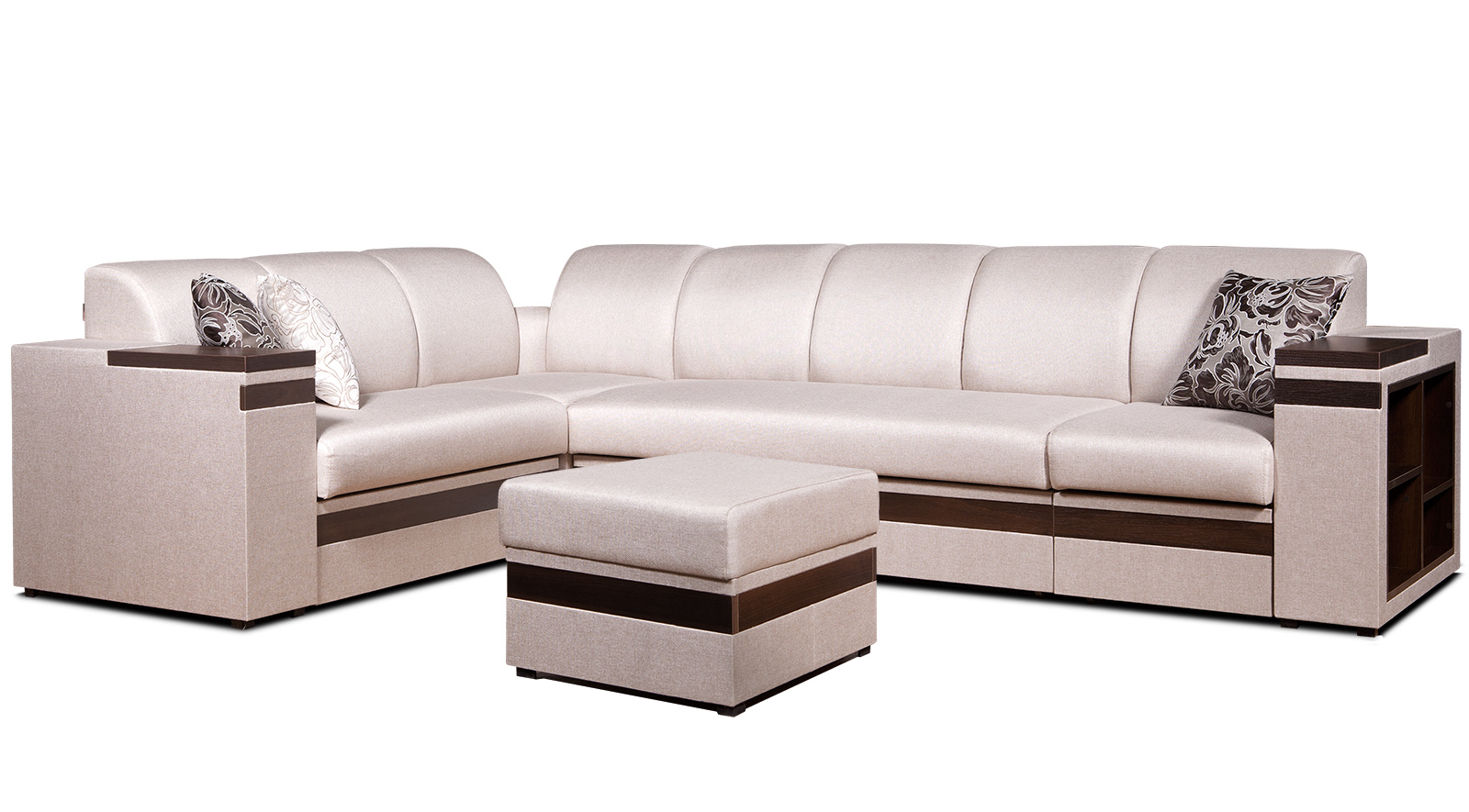 В состав модульной системы входят: сегмент боковой (левый, правый), сегмент 1, сегмент 2, сегмент 3, сегмент угловой, сегмент двойной, сегмент приставной, пуф. Сегменты 1, 2 и 3 могут дополняться нишей для хранения. Сегмент 3 изготавливается со спальным местом(2100 x 1200 мм) или без дополнительных опций.