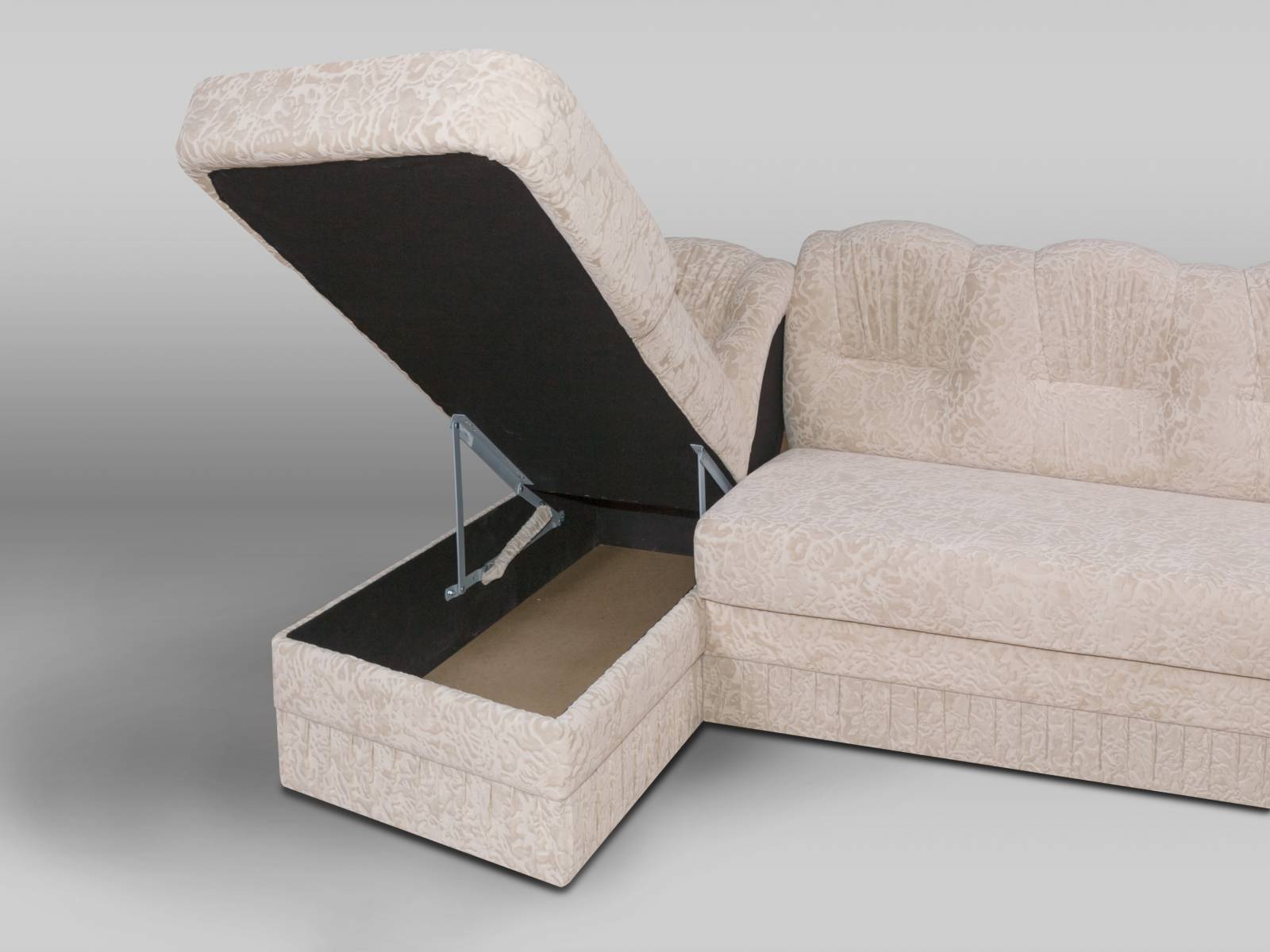 Модель выполняется как с правосторонним, так и с левосторонним расположением углового сегмента. Диван угловой «Моника» имеет два подлокотника. Благодаря такой конструкции эту модель можно располагать в комнате у окна. Более низкий, по сравнению со спинкой подлокотник у бокового сегмента будет минимально закрывать вид из окна. Для удобства транспортировки и установки диван изготовлен из двух частей, которые соединяются между собой с помощью замков – зацепов.