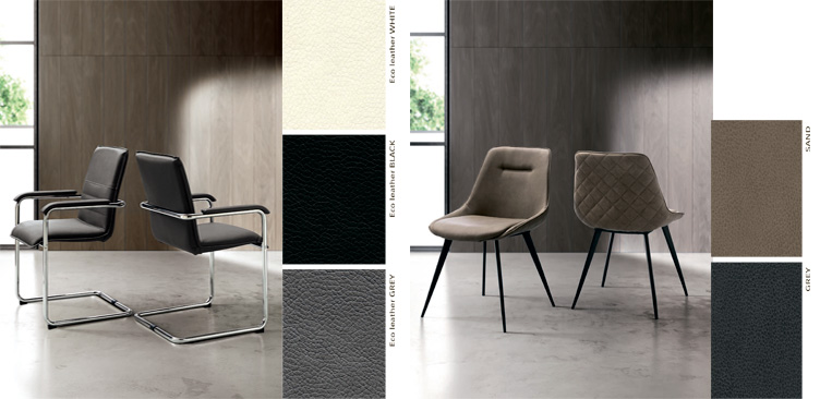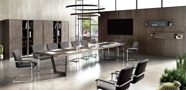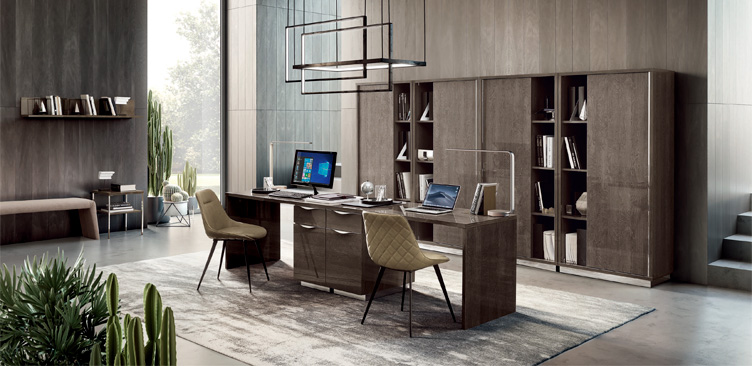 Кабинет с двумя письменными столами в версии DX/SX. Стулья с металлическим каркасом в обивке из эко-набука бежевого или серого цвета и четыре книжных шкафа.