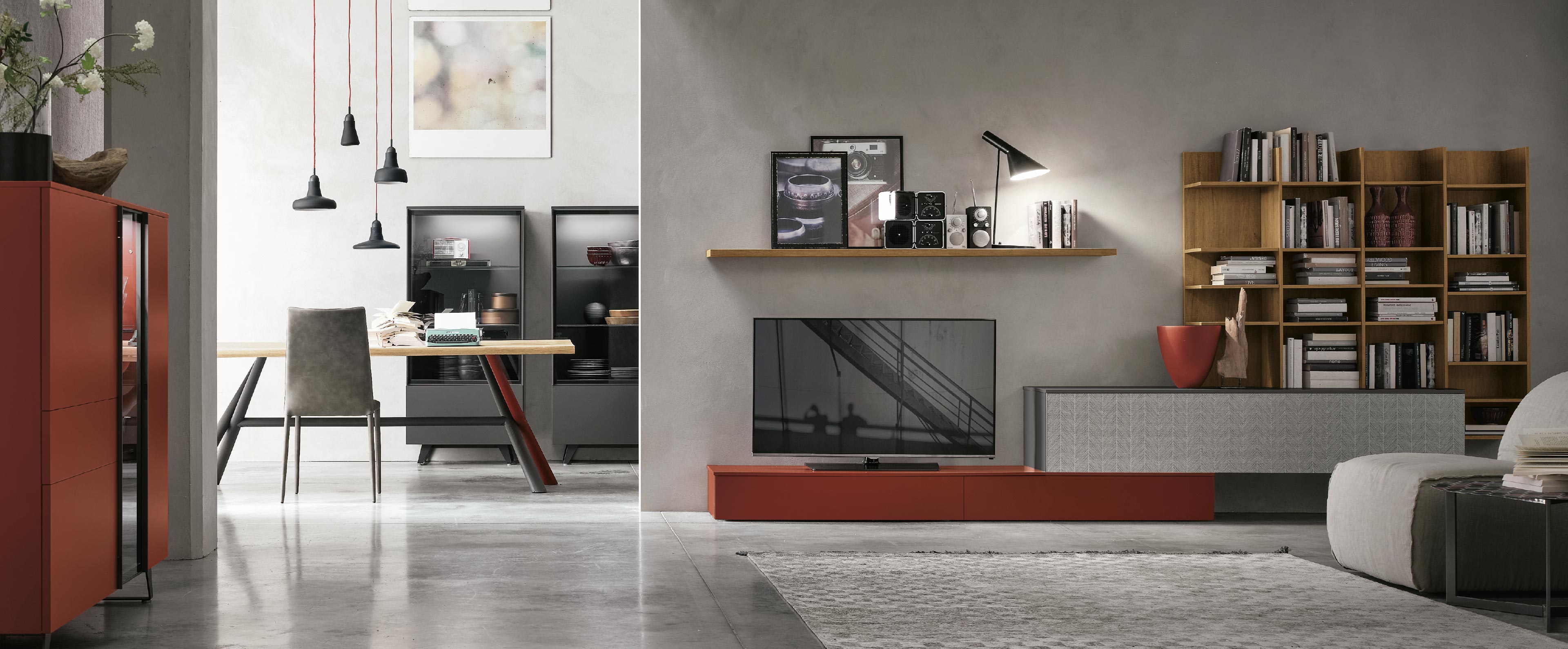 Вертикальная секция «Biblo» и полка с фактурной отделкой под светлый узловатый дуб.