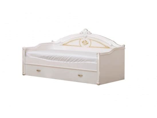 Кровать выполнена из ЛДСП 18 радика беж, кромка ABC, рама панели спинки и подлокотники ППУ. Панель спинки лак/шелкография. Фронт ящика лак. Для основного сп.места (1912х910) необходима металлическое основание (решетка) 1900х900 (не входит в состав изделия). Выдвижной ящик может использоваться как доп. спальное место 1810х810х180.