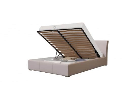 Размер спального места 1810х2010. Каркас кровати выполнен из ЛДСП и фанеры. Обивочный материал — ткань. Внутренние поверхности — флизелин. Наполнение — поролон 10-20 мм, синтепон. Кровать укомплектована ящиком для белья и ортопедической решеткой с подъемным механизмом.