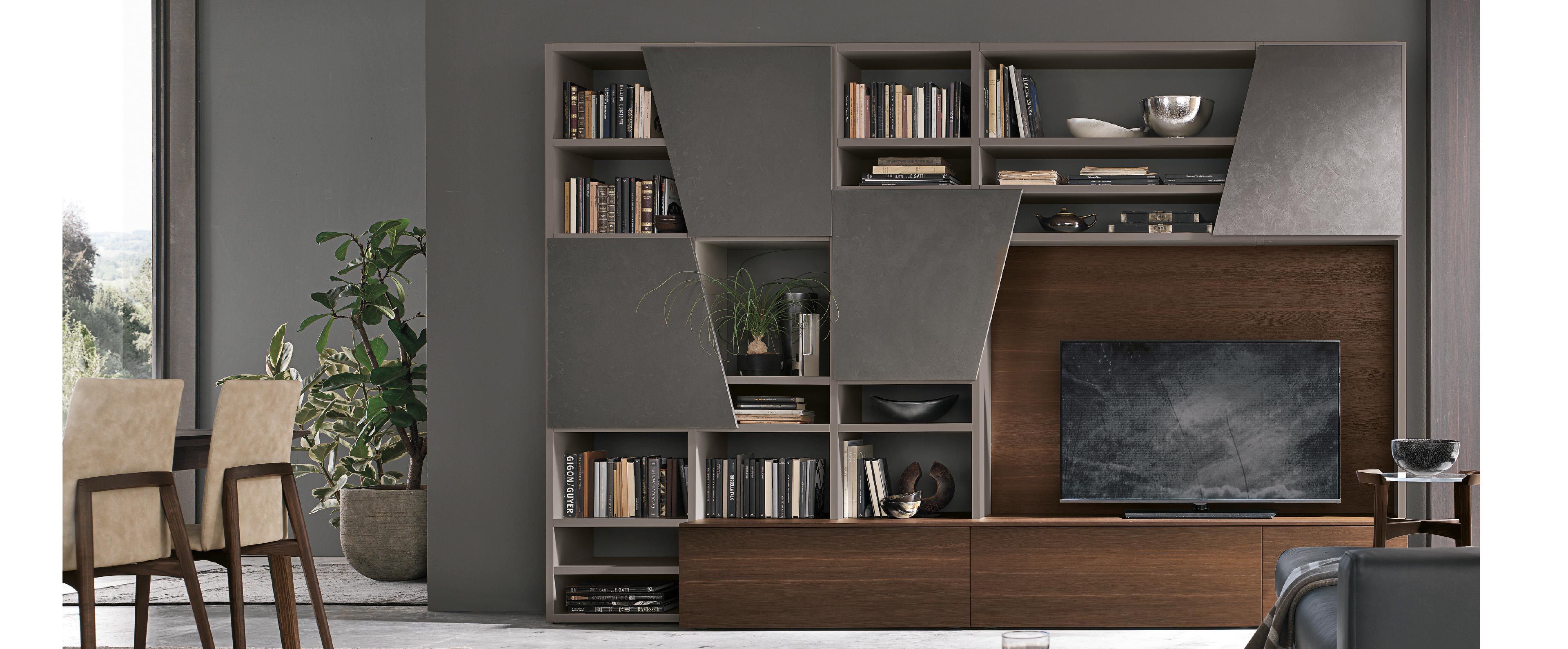Отделка как на фото / Базовые напольные тумбы и подставка под телевизор с фактурной отделкой из термически обработанного дуба, каркас матового лакирования цвета «Теплый серый» 127, дверцы Diagonal с фактурной отделкой цвета «Темный цемент».