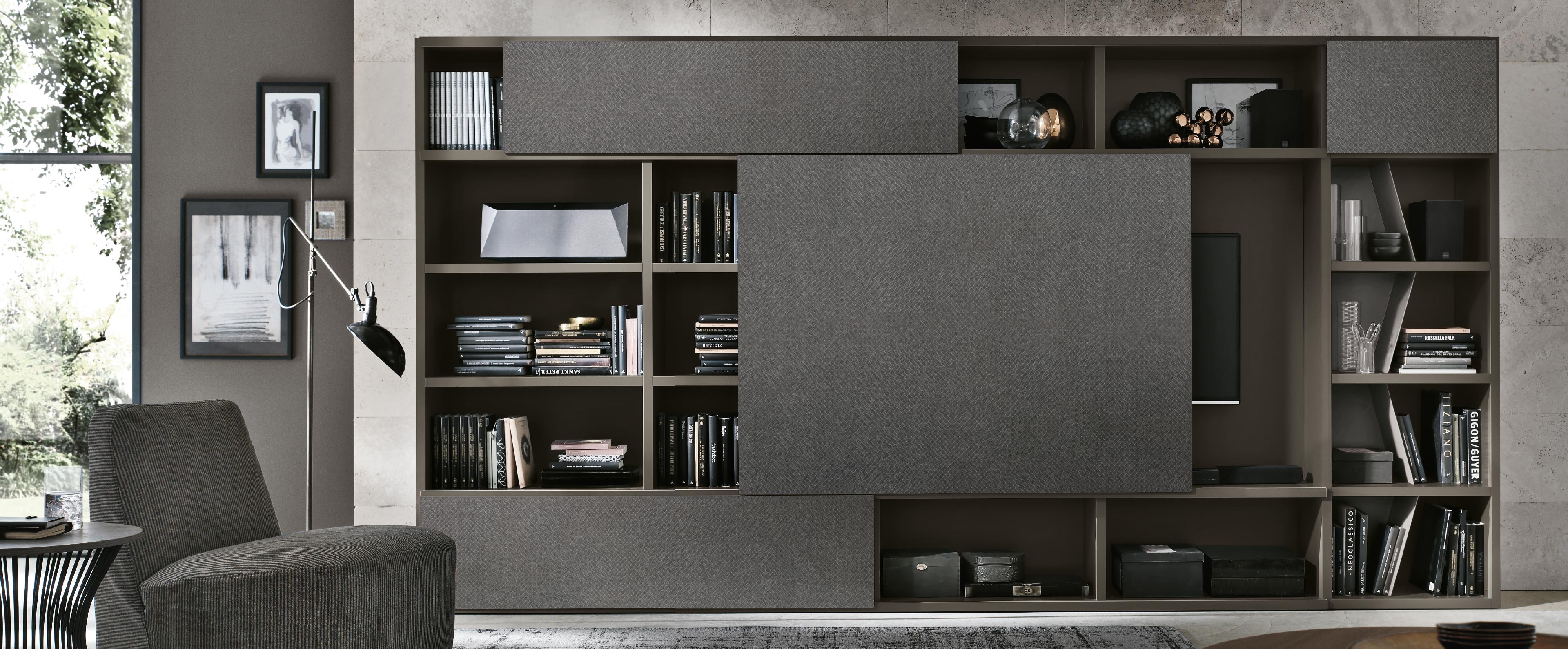 Гостиная – эта та комната в доме, которая больше чем другие должна уметь приспосабливаться. Створки скользят и, в зависимости от потребностей, открывают или скрывают элементы, позволяя жилой зоне преобразиться. Боковина с матовой лакировкой цвета «антрацит» 160 со створками с плетеной фактурной отделкой