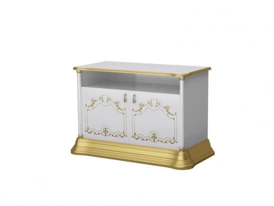 Тумба для ТВ является ярким, функциональным и эстетически привлекательным элементом коллекции «Роза». Изделие выполнено в классическом стиле в соответствии с общим оформлением гарнитура. Высококачественные материалы и стойкое покрытие поверхностей позволяют сделать тумбу под ТВ не просто частью обстановки интерьера гостиной, но и настоящим украшением, которое соответствует предпочтениям хозяев квартиры, а также местом хранения используемых в быту мелочей.