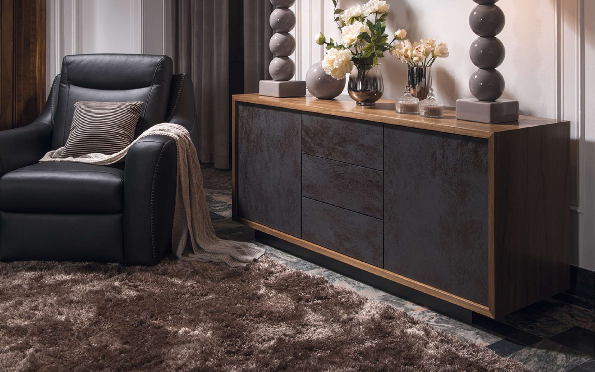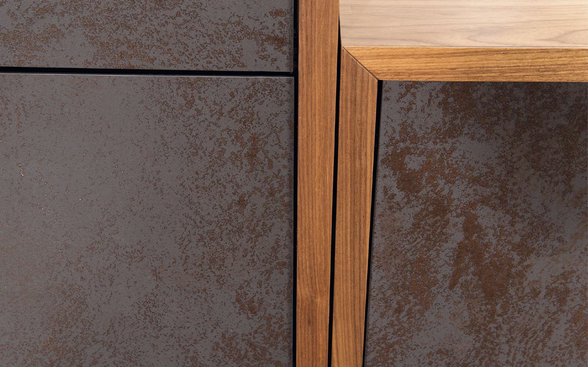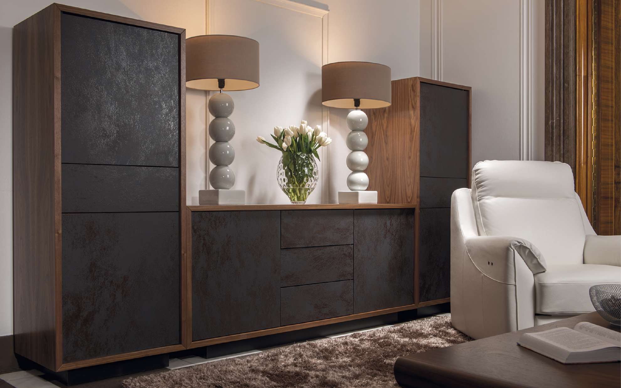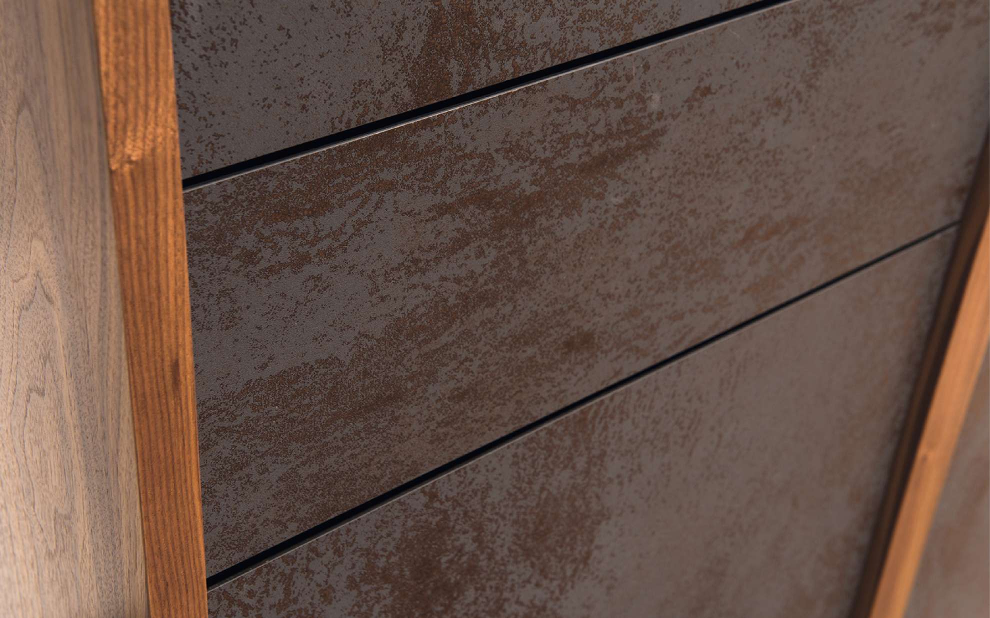 Комплектация: комоды, пеналы со стеклаянными дверцами, тумбы под ТВ и прикроватный • Корпус: натуральный шпон • Гладкие фасадов без ручек, открывающееся нажатие; фасады из керамического композита, изготовленные при помощи передовой технологии термической обработки кварца • Выдвижные ящики изнутри выстланы материалом с текстурой кожи • В пеналах со стеклянными дверцами цвет стекла подбирается в тон шпона: для черно-белого дуба — белое стекло, для американского ореха — прозрачное коричневое ,