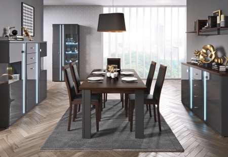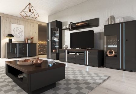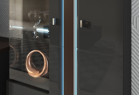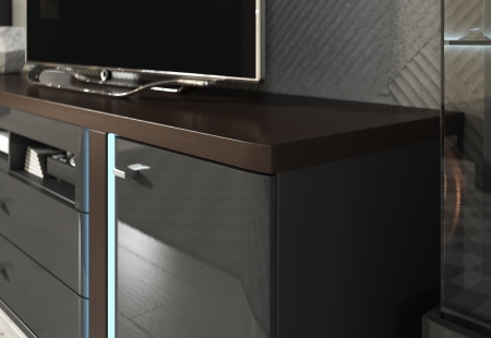 Коллекция EVARO характеризуется интересным сочетанием темно-серой ПВХ-пленки с натуральным шпоном из шпона в теплом шоколадном цвете. Вдоль декоративных планок спереди находится энергосберегающее светодиодное освещение, которое создает интересные отражения на высокоглянцевой ПВХ-пленке, используемой на фронтах. Для обеспечения большего комфорта при использовании мебели в дверях и ящиках используется бесшумная система.