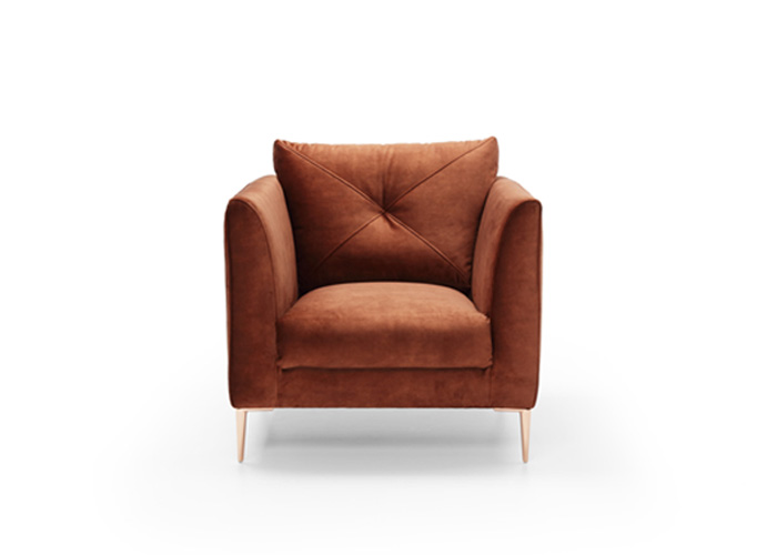 Современный с оттенком классики, легкий диван, на красивых металлических ножках в медном цвете. Фарина тщательно закончена, поэтому может стоять посреди комнаты. Задние подушки имеют