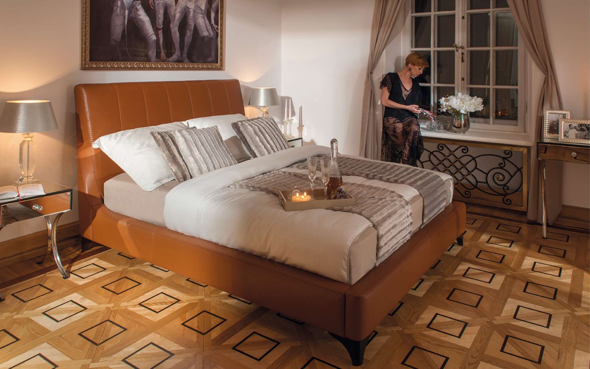 Кровать в обивке • Размеры матраца 160/180 см x 200 см • Дополнительное оборудование: ящик для постельных принадлежностей открывается без усилия благодаря современной конструкции с газлифтами • Деревянные ножки.