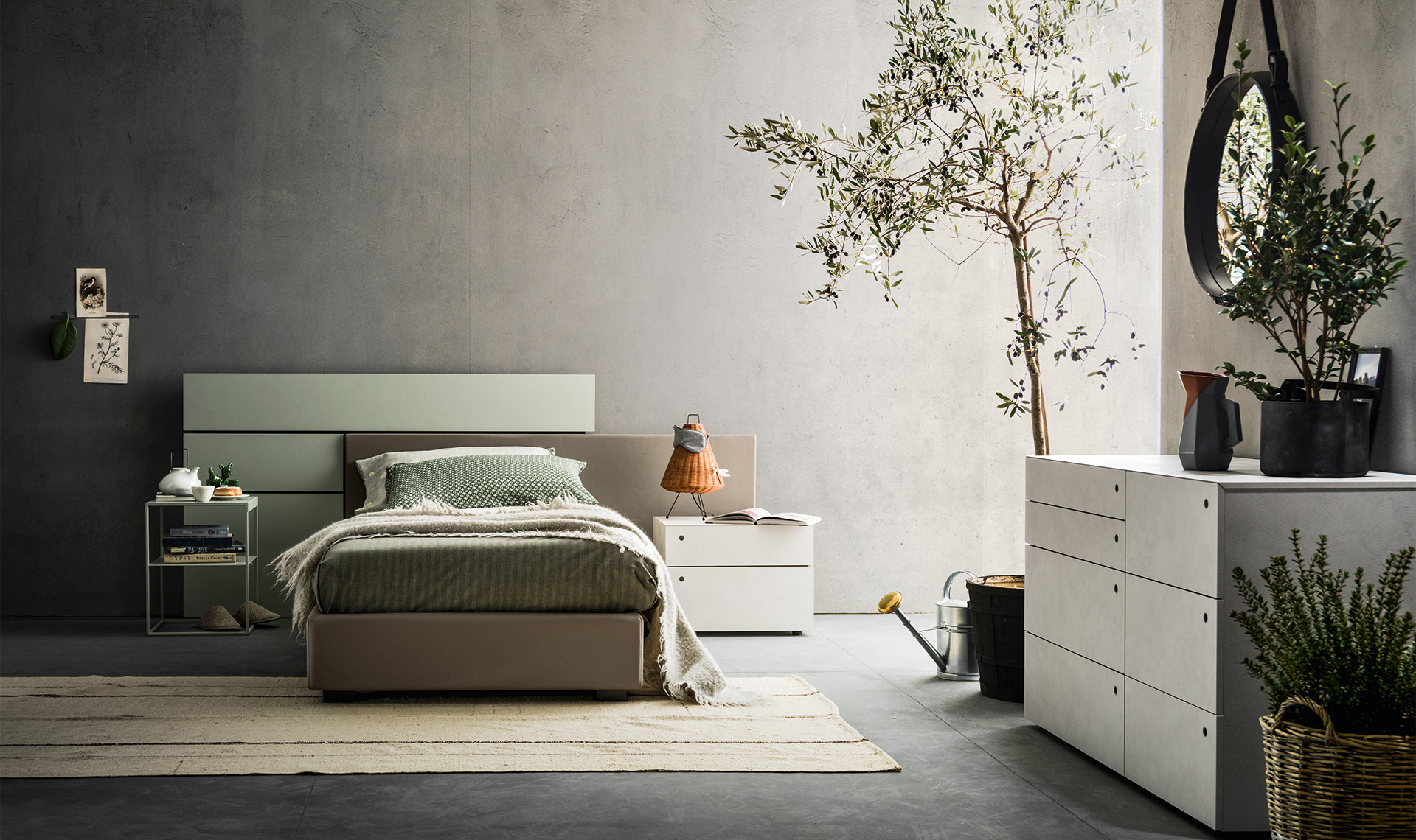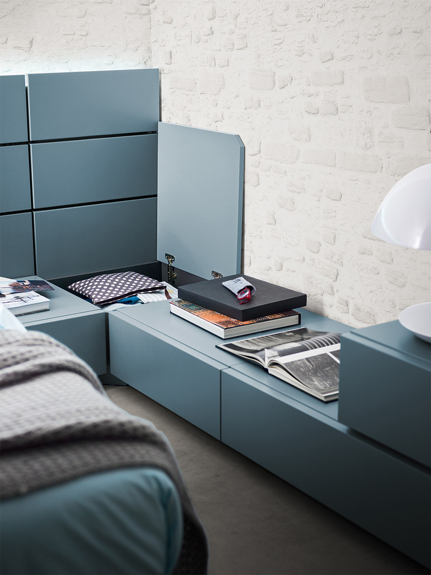 В абсолютной гармонии, деревянные или отделочные панели создают асимметричную игру, придающую визуальную значимость головной спинке