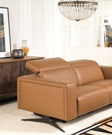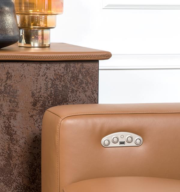 Комплект для отдыха, в состав которого входят модульные элементы, позволяющие создавать диваны для 2, 3 и 4 человек, а также подставки для ног • Модули можно формировать как прямые или угловые комплекты • Модуль с удлиненным сиденьем (шезлонг) позволяет удобно расположиться, выпрямив ноги – с дополнительной опцией выдвижения сиденья с помощью электродвигателя • Угловой модуль с терминалом • Функция релаксации, которая обеспечивает независимый подъем подголовника, выдвижение подножки – управление и электропривод осуществляются двумя независимыми двигателями (по выбору питание от аккумулятора) • Порт USB на панели управления • Функция HOME, позволяющая автоматически складывать подножку и подголовник в исходное положение • Бар/отсек с регулируемой вращающейся столешницей (орех американский), дополнительное оборудование: два холодильника (охладителя) с индукционным зарядным устройством, световой индикатор, панель с разъемом питания, портами USB, индукционное зарядное устройство • Металлические ножки (2 версии на выбор) • Опция: управление функциями релаксации с помощью пульта Bluetooth.