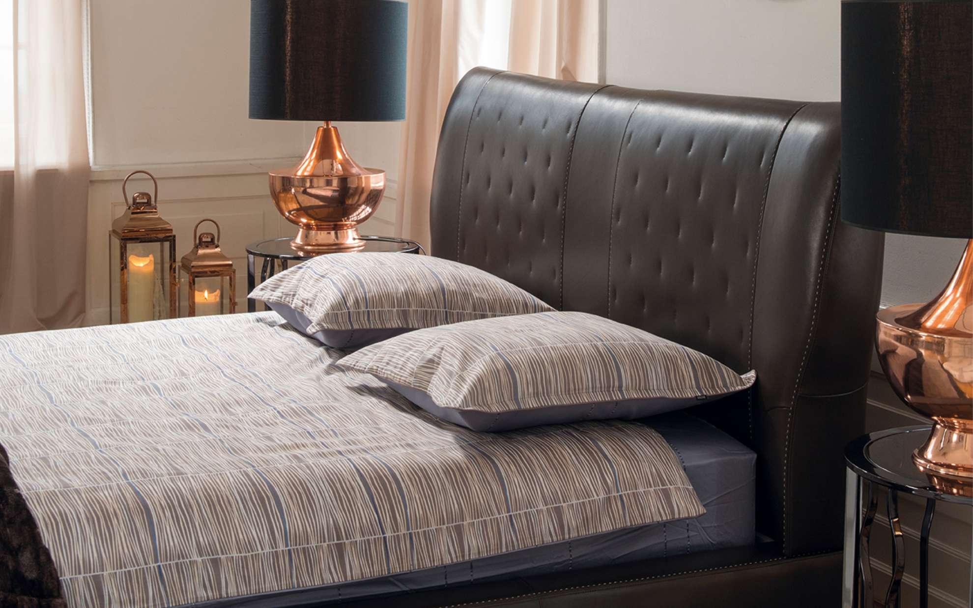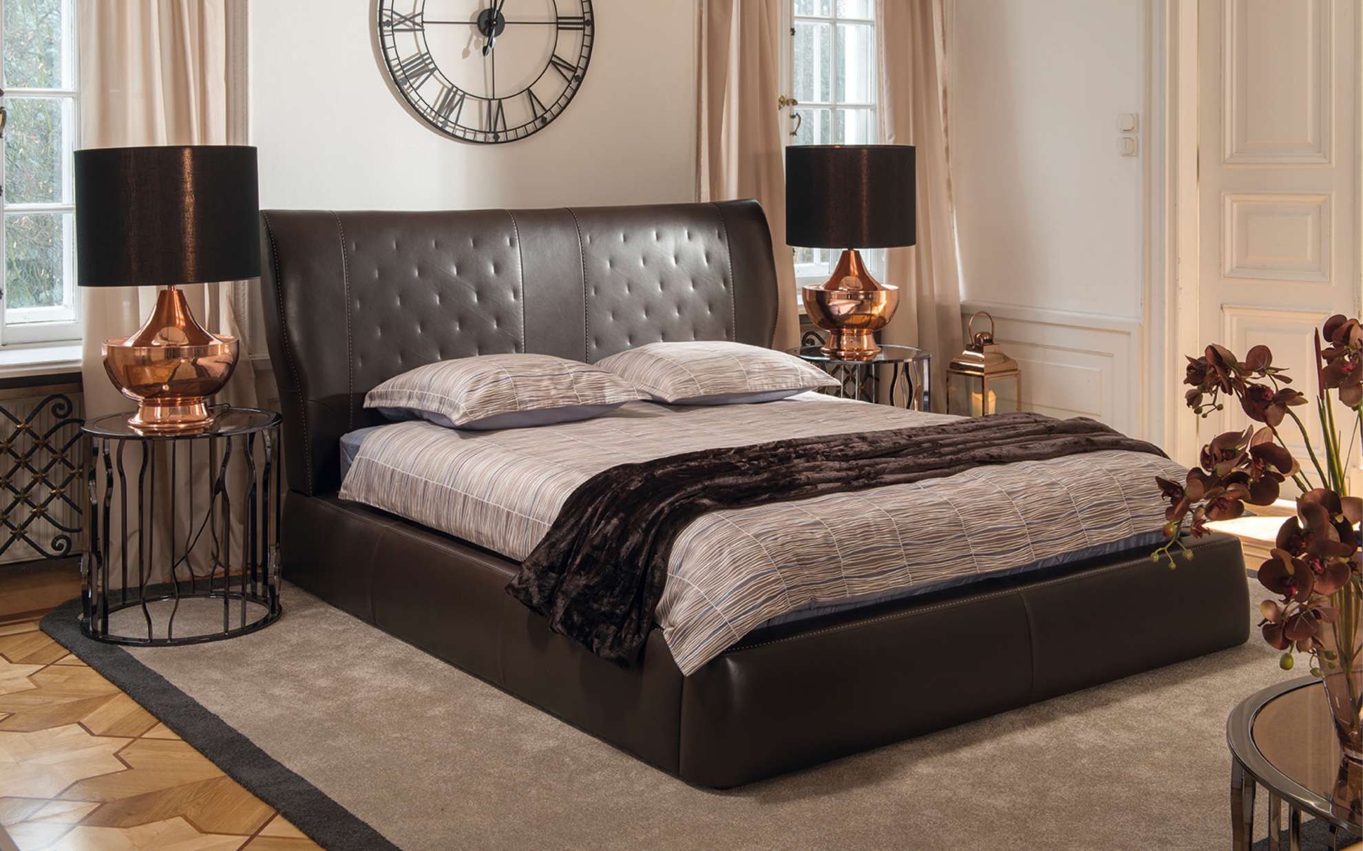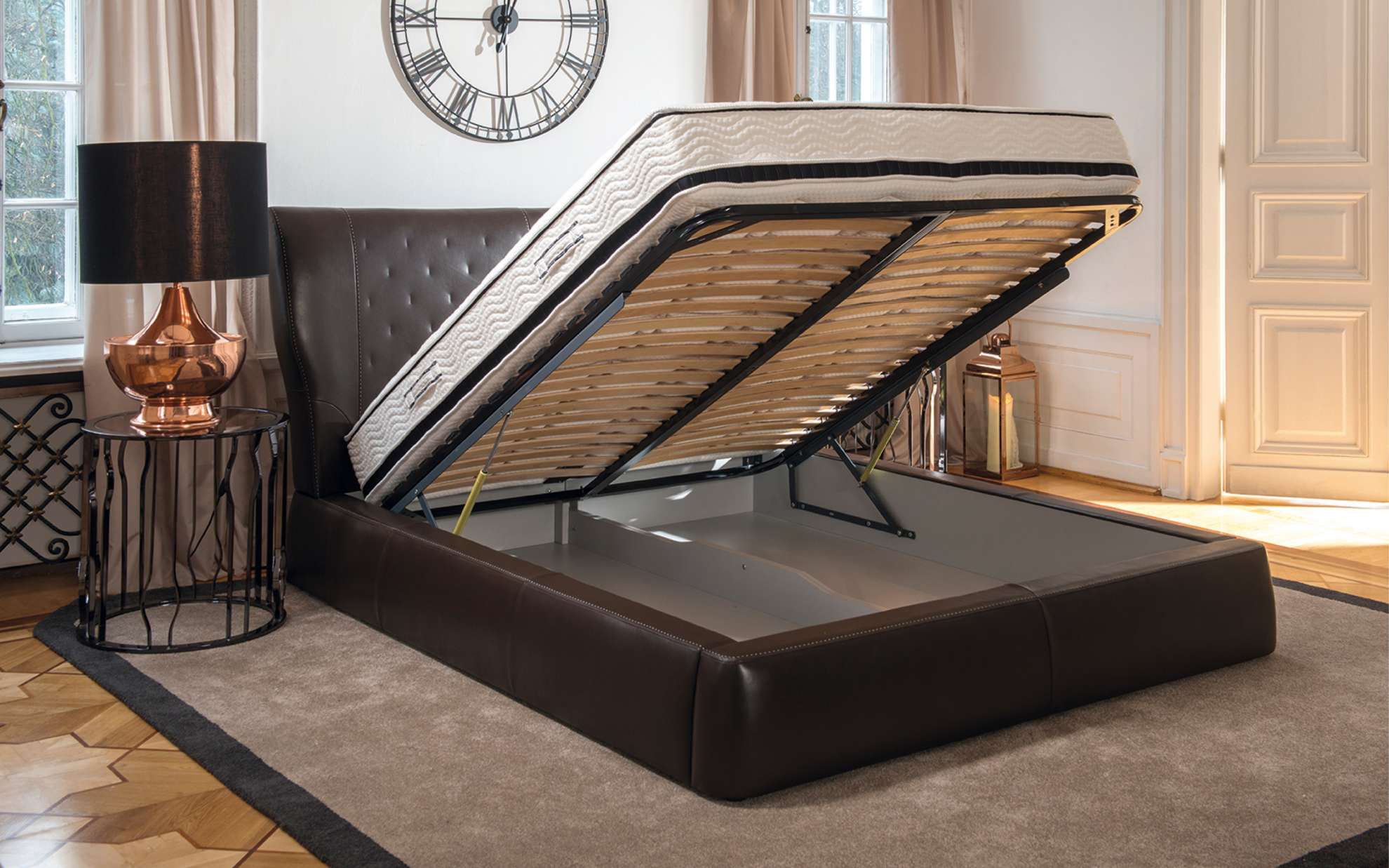 Кровать в обивке • Размеры матраца 160/180 см x 200 см • Дополнительное оборудование: ящик для постельных принадлежностей открывается без усилия благодаря современной конструкции с газлифтами. • Цоколь в обивке или деревянные ножки.