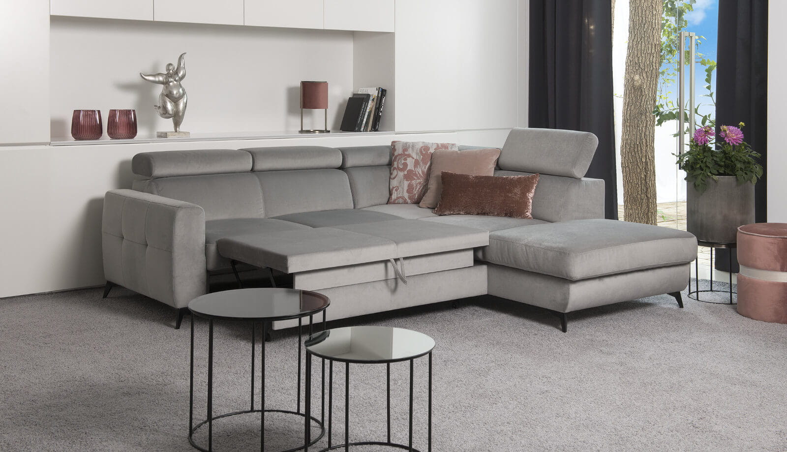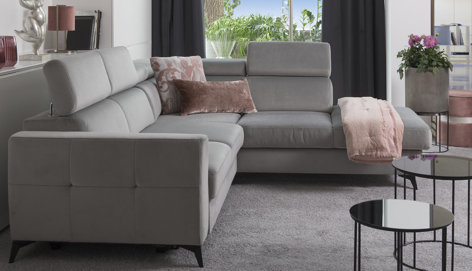 Модуль в виде шезлонга с дополнительной функцией регулируемых подголовников позволяет легко адаптировать место отдыха к индивидуальным потребностям. Угловой диван имеет также функцию сна, а также легко доступный ящик для хранения постельного белья. Все это расположено на хромированных ножках, благодаря чему изделие приобретает утонченную элегантность.Диван с функцией сна и скрытым ящиком для постельных принадлежностей обеспечивает дополнительные преимущества и удобство. Регулируемые подголовники с функцией регулировки наклона являются большим преимуществом и удобным вариантом для комфортного отдыха. Благодаря возможности их регулировки мы можем изменять дизайн углового дивана. Все дополнено хромированными ножками.Ткань, произведенная по технологии Cleanaboo, которая ограничивает впитывание воды – пролитая жидкость (вода, кофе, вино) формируется в капли и не проникает внутрь ткани. В результате минимизирует риск повреждения мебели. Благодаря этому ткань долгое время остается новой.Сидения на основе высокоэластичного поролона HR (High Resiliense Foam), который дает ощущение идеальной мягкости и упругости, одновременно обеспечивая более длительный срок службы (упругости) сидения.